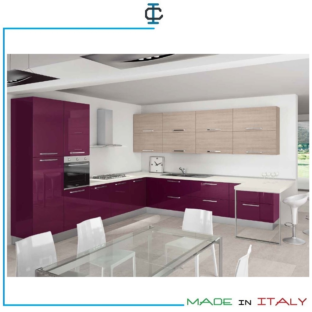 Ante sp.18 mm bordati in ABS Struttura in pannello nobilitato in classe E1 Cassetti e cestoni con guide soft Finitura Prugna lucido Piedi e zoccolo h. 12 Top in bianco sp.6 cm Maniglia di serie