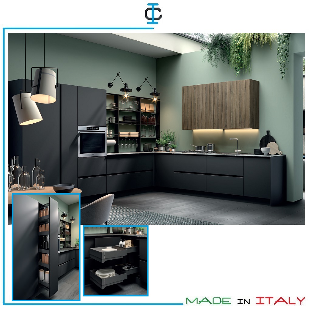 Cucina Dispensa con Gola. Cucina composta da : colonna frigo, colonna dispensa estraibile, colonna forno, base angolo con magic corner, zona cottura, zona lavello, pensili. Cucina con struttura in Pannello Ecologico in classe E1 / CARB2, ante finitura Antracite e Noce. Su richiesta è possibile laccare opaco con tinte a scelta RAL. Stile Contemporaneo. Misure (cm): L.338 x 365 P. 60 H.240