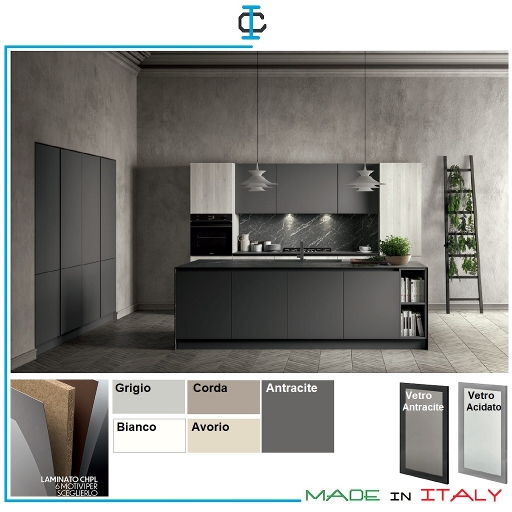 Cucina con Isola e Colonne. Cucina con ante in laminato CHPL, finitura tinta Antracite con gola. Cucina composta da : Colonne dispensa, colonna forno, zona cottura, colonna frigo, isola con zona lavello. Stile Contemporaneo. Misure (cm): Colonne L.246 P.60 H.216 Parete L.330 P.60 H.216 Isola L.270 P.90