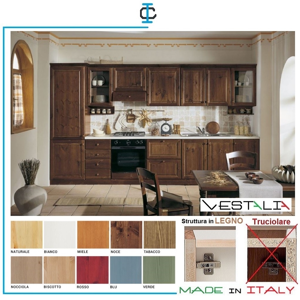 Cucina VESTALIA in Pino tinta Noce. Cucina componibile con struttura in legno listellare, cassetti in legno multistrato, ante in Pino Massello finitura Noce. Cucina composta da : colonna frigo, cassetti, zona cottura, cestoni, zona lavello, pensili. Stile Rustico. Misure (cm): L.360 P.60 H.219