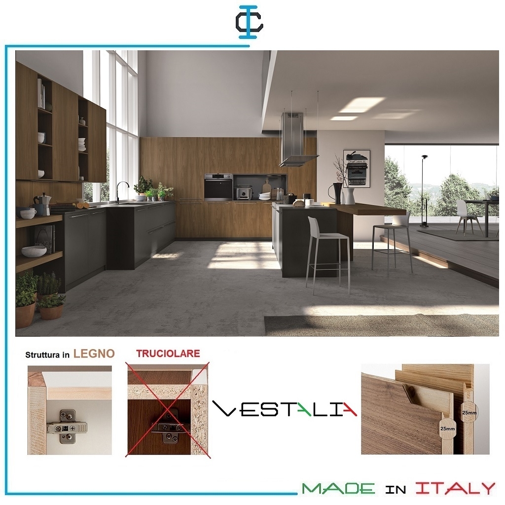 VESTALIA propone cucine in legno listellare, personalizzabili in materiali, misure e colori.