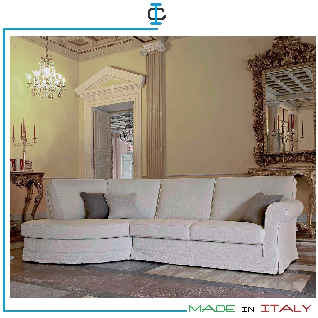 Divano 2 posti intermedio con penisola e balza in stile classico. Divano imbottito rivestito in tessuto con angolo penisola sagomata. Struttura in legno massello di abete e multistrato, imbottitura in poliuretano espanso, piano di molleggio con cinghie elastiche.