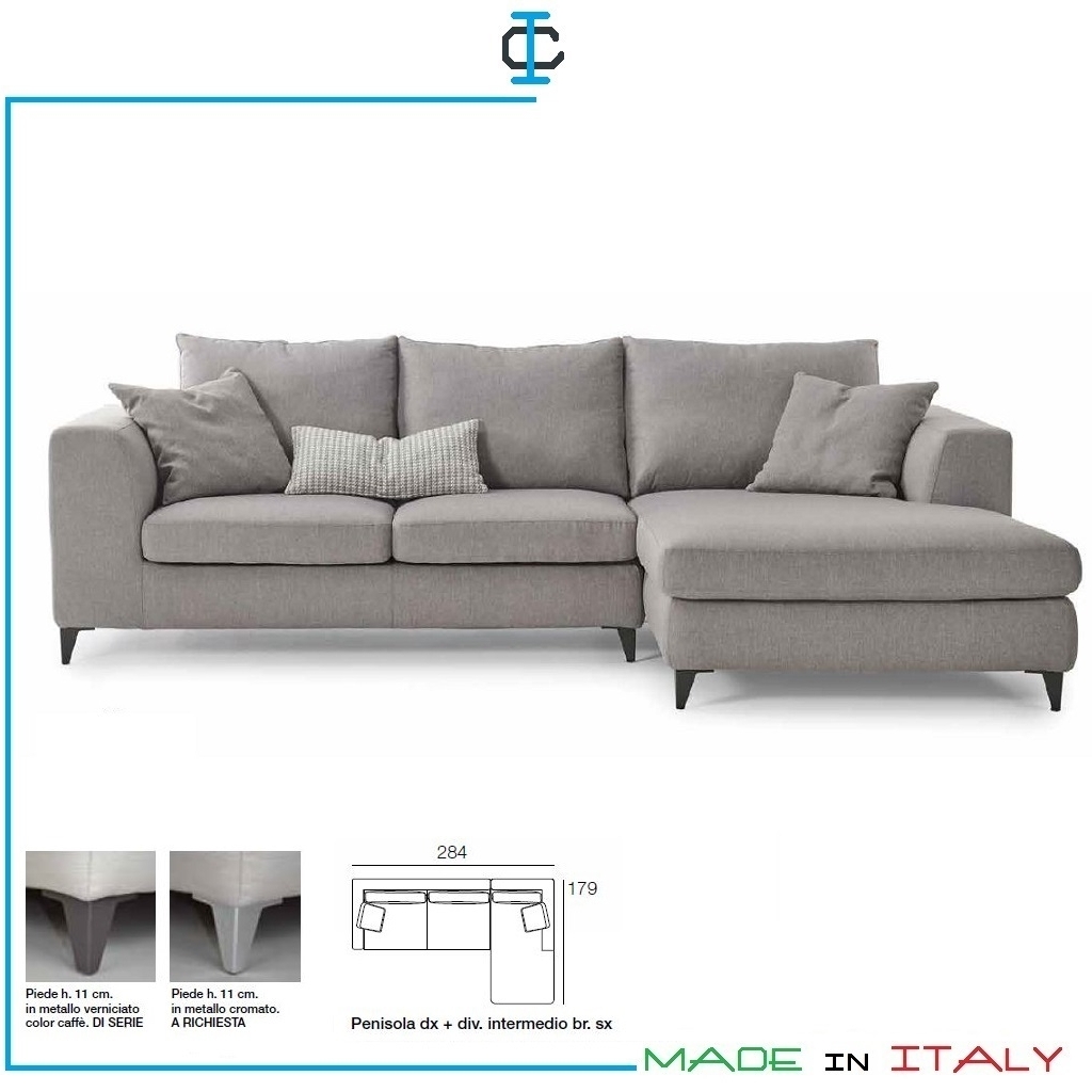 Divano Penisola con piedi in metallo. Divano con struttura in legno, componibile, completamente sfoderabile, con tessuti e tinte a scelta. Divano composto da : 2 divani 2 posti, 1 penisola. Design Contemporaneo. Misure (cm): L.274 x 179 H.85 P.102 Escluso : cuscini. Divano disponibile anche in versione : - 3 posti + penisola L.314 x 179 ( € 2.813) - 2 posti + penisola L.264 x 179 ( € 2.596) - 1 posto + penisola L.203 x 179 ( € 2.205)