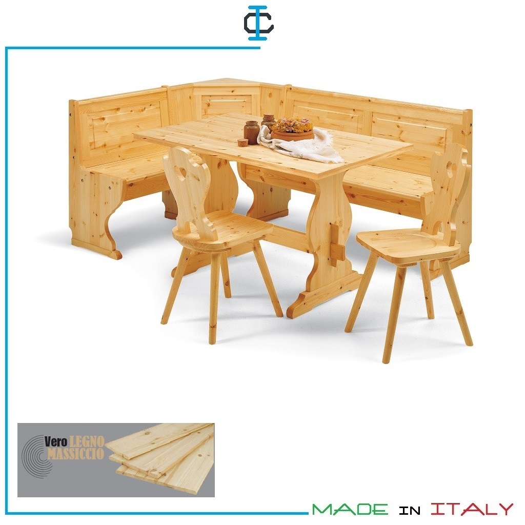 Giropanca contenitore in legno massiccio. Giropanca realizzato in legno Pino in finitura tinta Naturale con fianchi sp.3 cm. Giropanca composto da : 1 panca L.76 cm., 1 panca angolo L.57 x 57 cm., 1 panca L.136 cm., 1 tavolo, 2 sedie. Stile Rustico. Misure (cm): Giropanca L.133 x 193 P.49 H.86 Tavolo L.130 P.82 H.76 sp.4 cm.