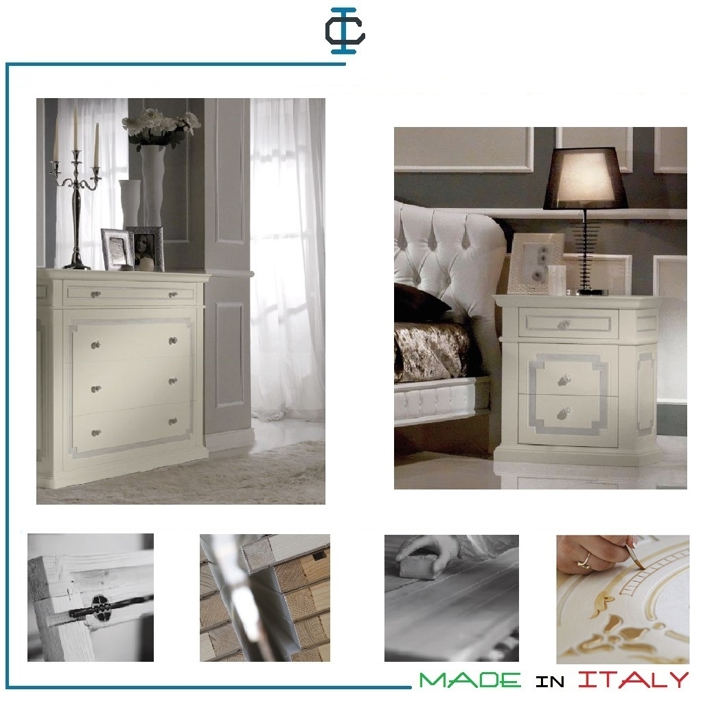 Comò e Comidini in stile classico laccato con struttura in legno d'abete tamburato e finitura arte fiorentina a cera. Decorazioni realizzate a mano. Collezione Classics Made in Italy. Misure (cm):