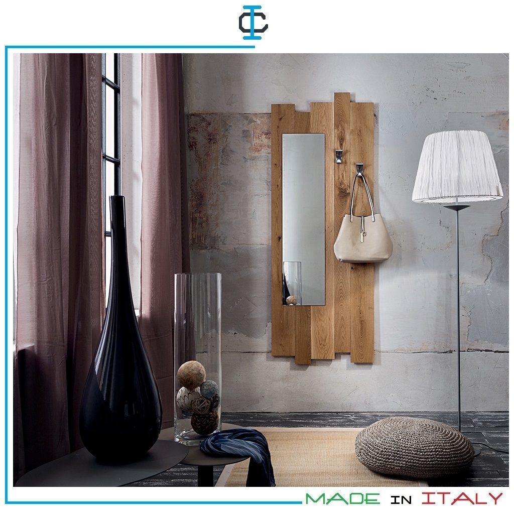 Ingresso in Rovere massello con specchio alto, composto da: Specchio sospeso su travi di legno, 2 appendiabiti. Materiali e produzione Made in Italy.