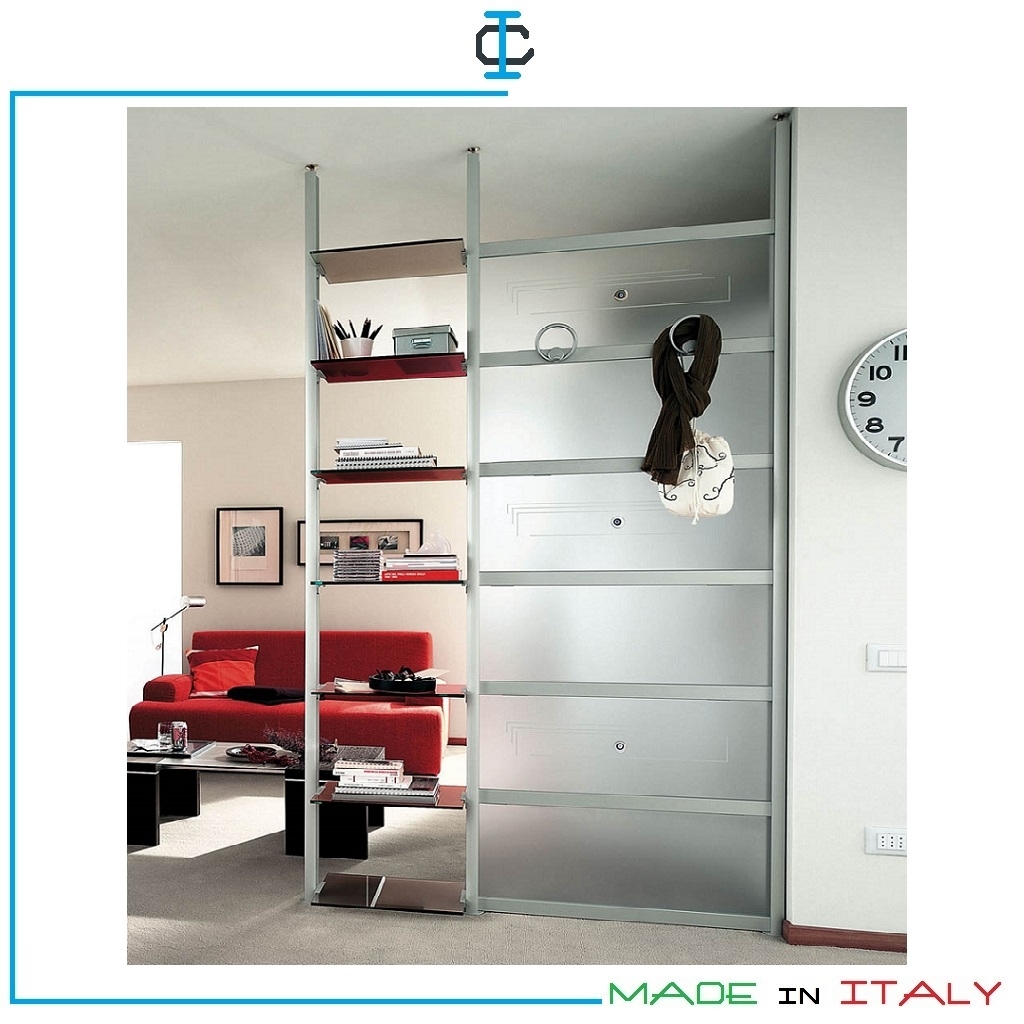 Interparete Appendiabito in Vetro per separare ingresso o disimpegno da altri ambienti. Interparete in stile moderno. Interparete composta da: 6 formelle in verto, 7 mensole in vetro, 2 appendiabito, grigliato in alluminio anodizzato. Finitura : vetro satinato, vetro satinato sabbiato con murrine, vetro rosso, arancio e marrone. Materiali e produzione Made in Italy. Interpareti realizzate da esperti falegnami.