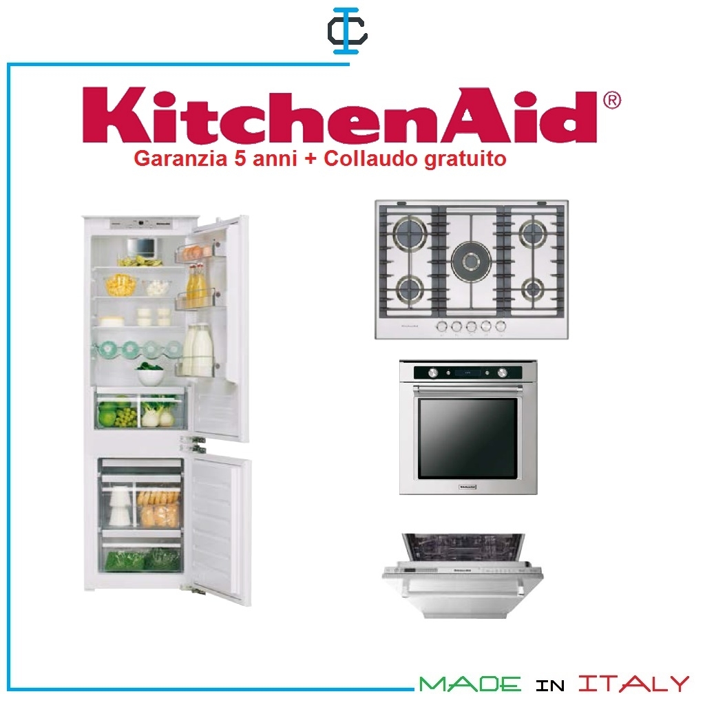Kit Elettrodomestici KitchenAid composto da n° 4 pezzi : Frigorifero congelatore , piano cottura gas, forno, lavastoviglie. Il kit elettrodomestici da incasso è per cucine componibili e cucine su misura.