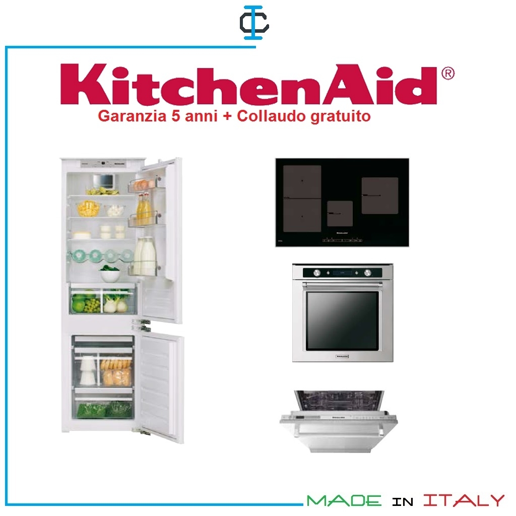 Kit Elettrodomestici KitchenAid composto da n° 4 pezzi : Frigorifero congelatore , piano cottura induzione, forno, lavastoviglie. Il kit elettrodomestici da incasso è per cucine componibili e cucine su misura.
