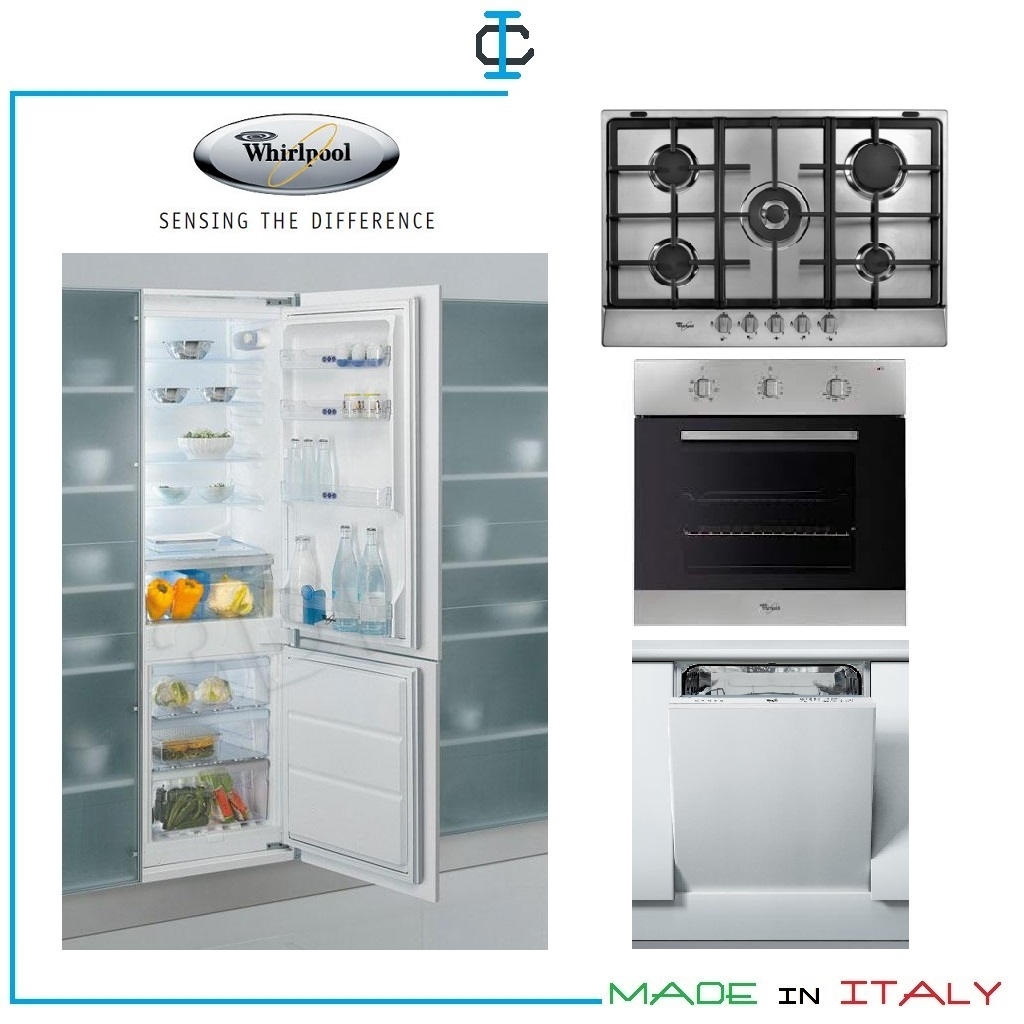 Kit Elettrodomestici Whirlpool composto da n° 4 pezzi : Frigorifero congelatore , piano cottura gas, forno, lavastoviglie. Il kit elettrodomestici da incasso è per cucine componibili e cucine su misura.