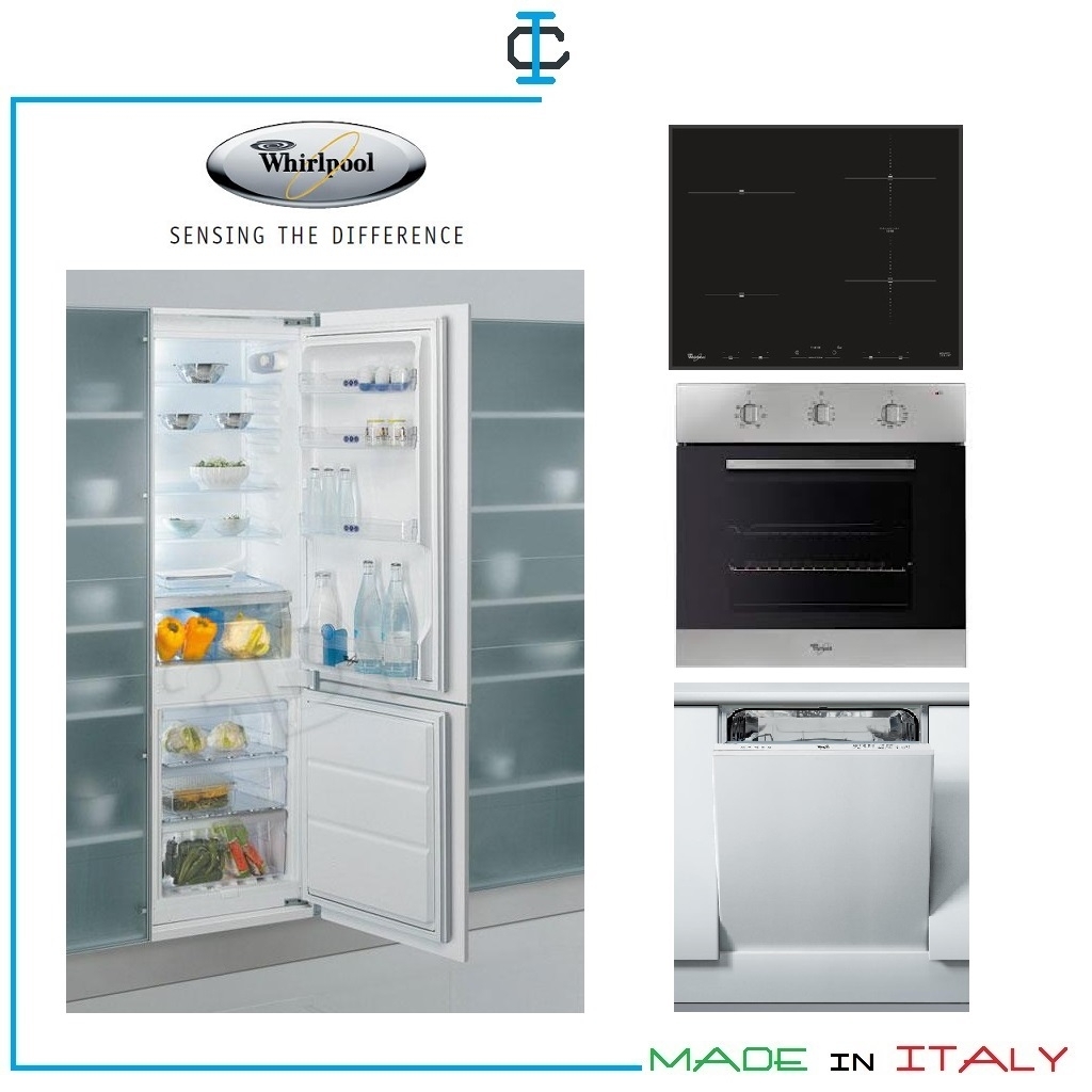 Kit Elettrodomestici Whirlpool composto da n° 4 pezzi : Frigorifero congelatore , piano cottura induzione, forno, lavastoviglie. Il kit elettrodomestici da incasso è per cucine componibili e cucine su misura.