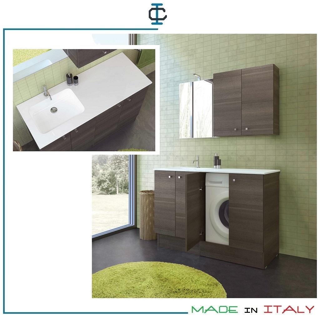 Mobile Lavanderia con portalavatrice di profondità ridotta. Mobile lavanderia moderno composto da portalavabo, coprilavatrice, pensile, specchio, lampada, consolle lavatoio in Acrilik. Struttura realizzata con pannelli Idropan V100 idrofughi verniciato con prodotti ecologici antibatterici. Prezzo composizione come foto, miscelatore escluso. Misure (cm): L.131 P.520 H.200