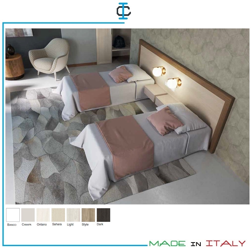 Letti Singoli per Hotel, linea Contract. Letti singoli per settore Contract, Hotel, Pensioni, Bed and Breakfast, settore Turistico. Composizione con : 1 Testata L.315 cm. , 2 Letti L.80 P.190 cm., 2 Comodini sospesi L.45 cm. Struttura pannello ecologico in classe E1, a basso contenuto di formaldeide. Finitura in laminato con tinte a scelta. Rete a doghe inclusa. Design Contemporaneo.