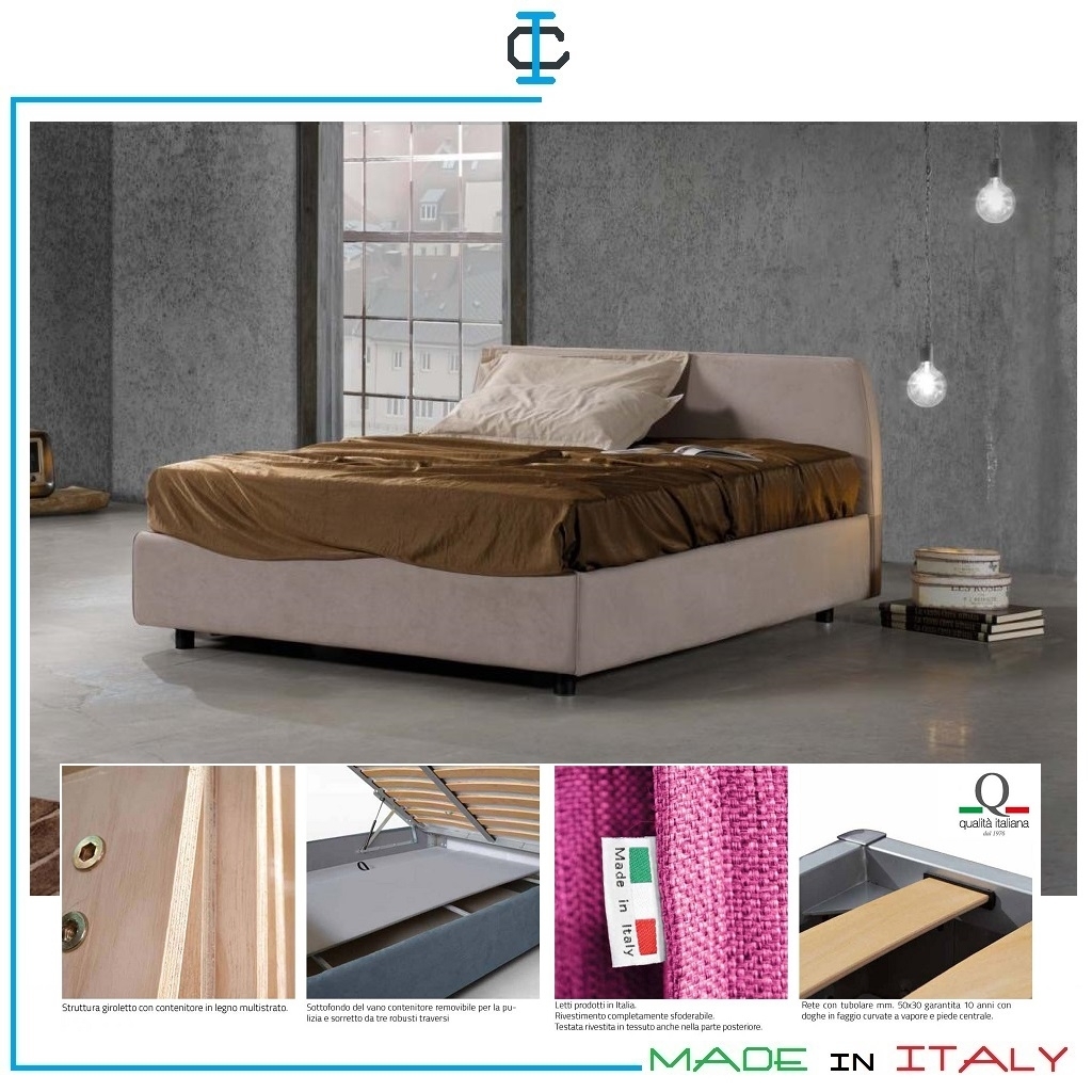 Letti mod. Monaco imbottiti con contenitore normale in versione matrimoniale. Letto moderno, composto da testiera e contenitore. Testiera imbottita con tessuto a scelta. Materasso opzionale.