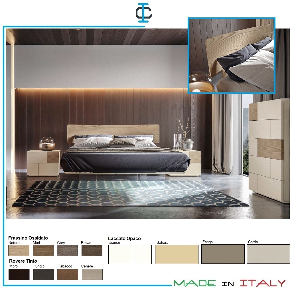 Letto sospeso con testiera curvata. Letto matrimoniale con piede in plexiglass. Letto matrimoniale con testiera curvata in Frassino ossidato e giroletto laccato opaco burro. Letto sospeso incluso di rete in legno. Design Contemporaneo.