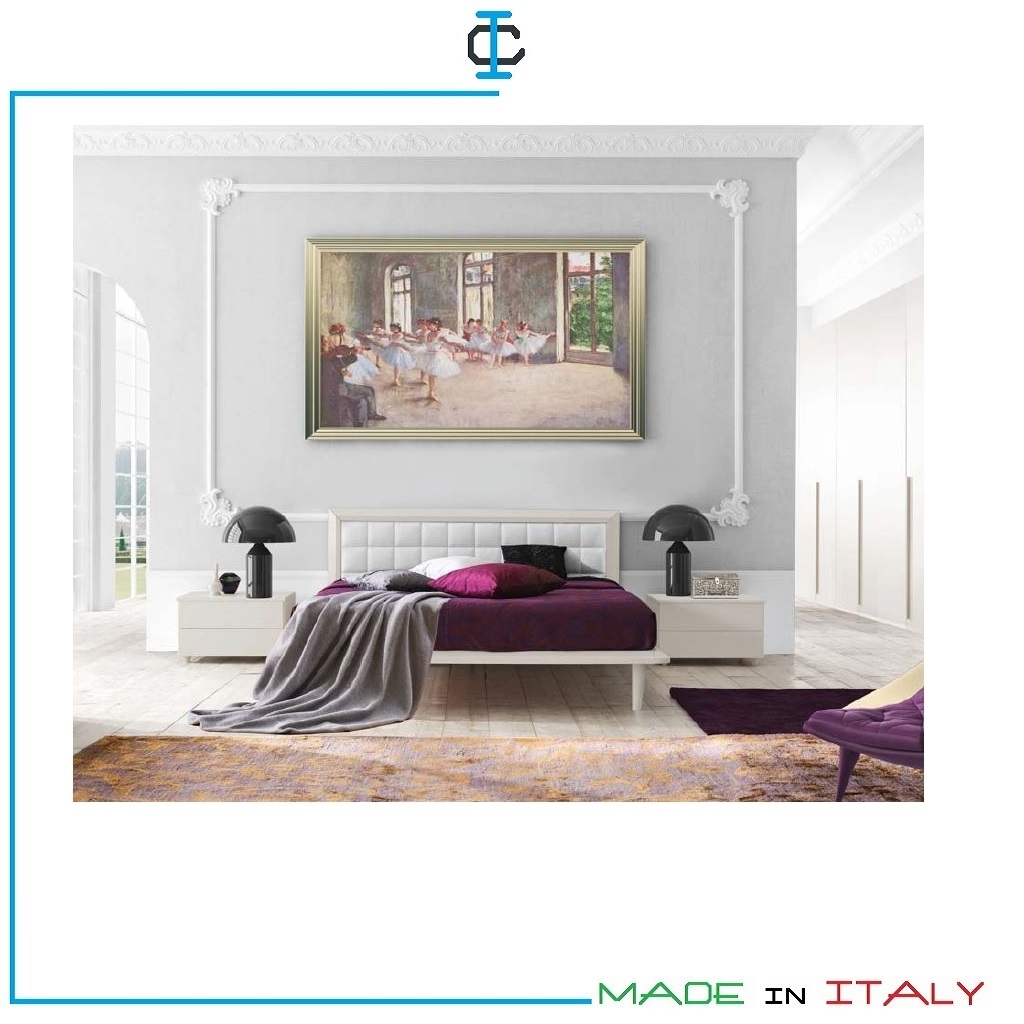 Letto Matrimoniale Design composto da testiera imbottita con cornice perimetrale e giroletto sagomato. Letto con piedi in legno in tinta. Testiera imbottita con cornice in pannello ecologico 18 mm con finitura in laminato con tinte a scelta. Rete e materasso opzionali.