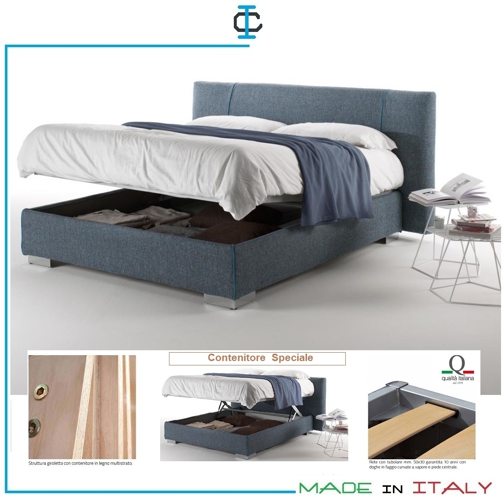 Letto mod. Virgilio imbottito con contenitore in versione matrimoniale. Letto moderno, composto da testiera e contenitore. Testiera imbottita con tessuto a scelta. Materasso opzionale.