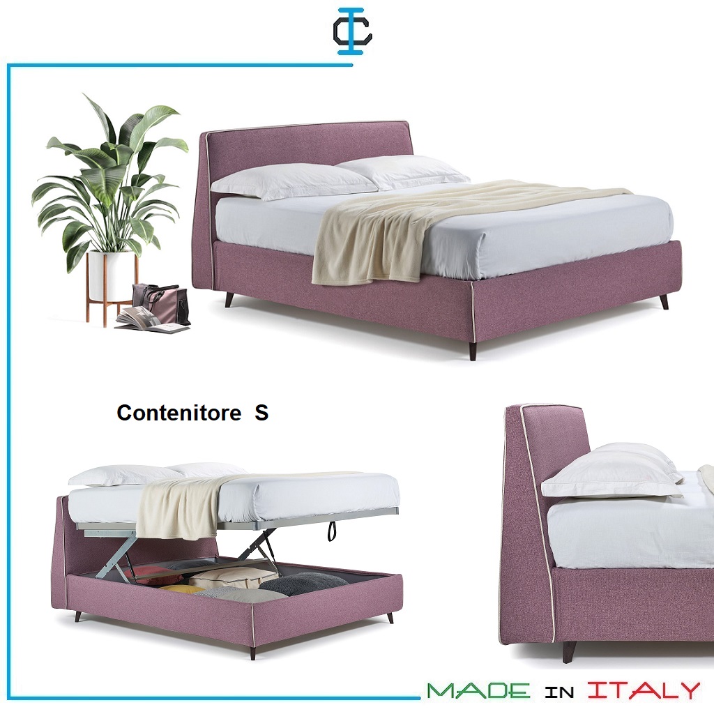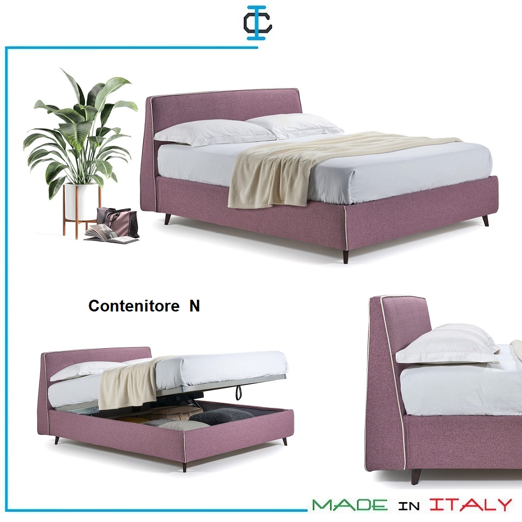 Letto mod.Sazeu imbottito con giroletto alto in versione matrimoniale. Letto moderno, composto da testiera e giroletto. Testiera imbottita con tessuto a scelta. Materasso e rete opzionali. Misure (cm): L.171 P.221 H.96