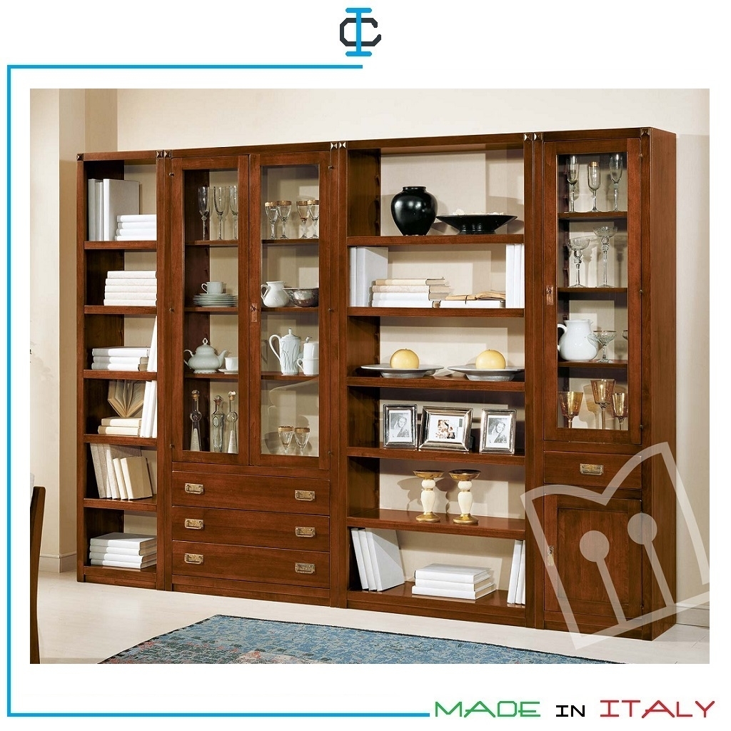Libreria in arte povera H.210 . Libreria composta da : 1 colonna libreria piccola, 1 colonna con cassetti e vetrine, 1 colonna libreria grande, 1 colonna con anta cassetto e vetrina. Struttura ed ante in massello di pioppo sp. 27 mm con schienale tappezzato. Finiture: Noce anticato