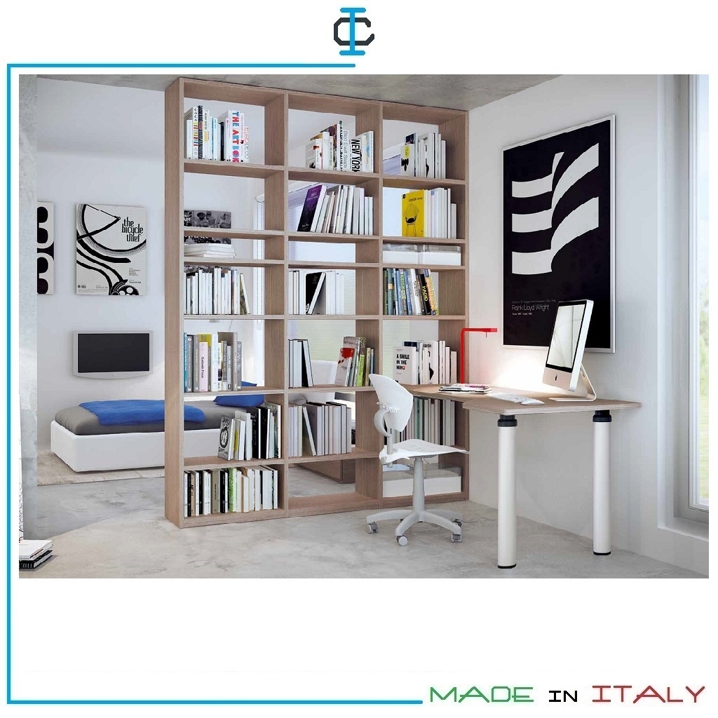 Libreria componibile bifacciale con rifinitura su entrambi i lati realizzata in pannello ecologico certificato. Libreria bifacciale personalizzabile su misura. Scrivania e sedia non inclusi. Altezze ripiani personalizzabili su richiesta senza variazione di prezzo. Design moderno