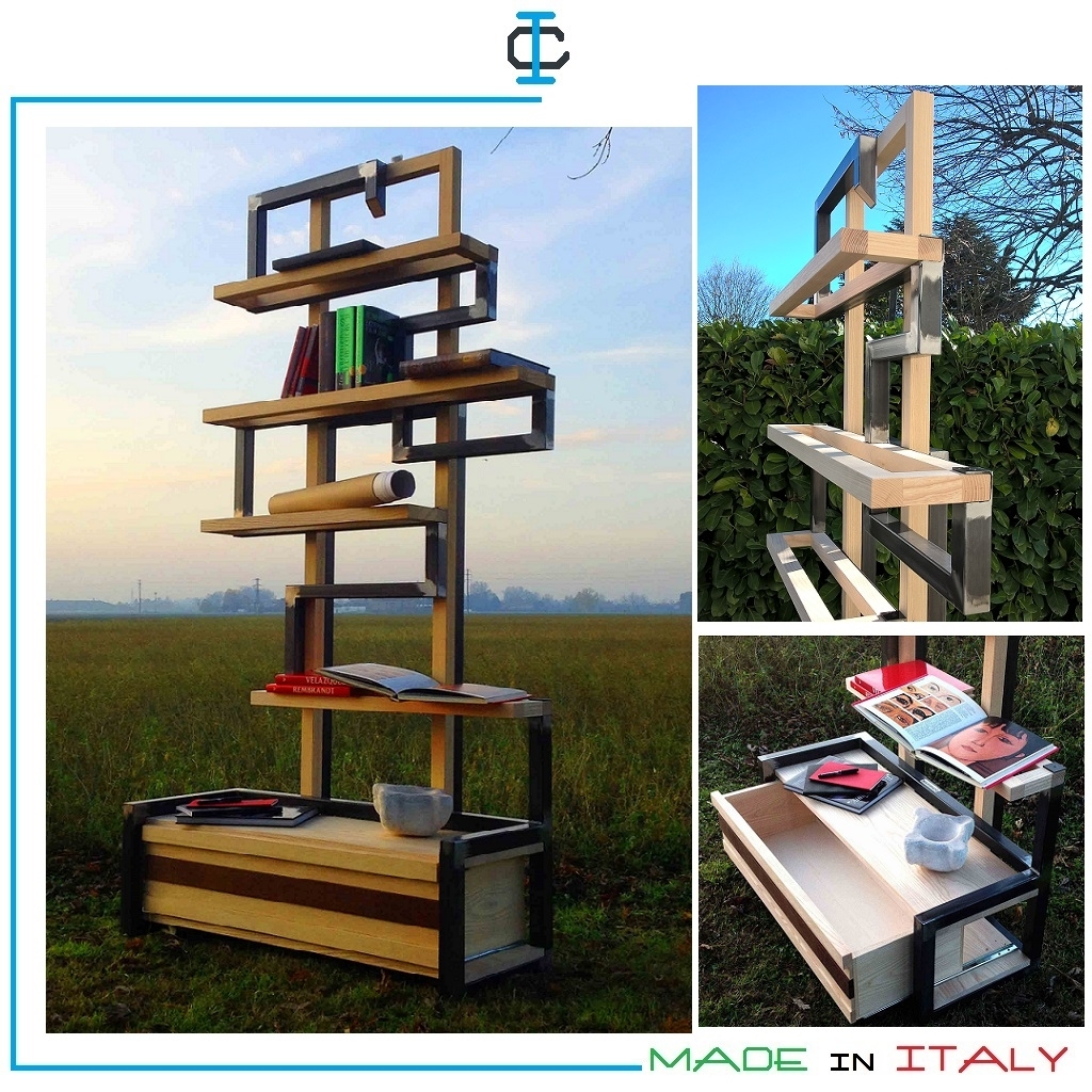 Libreria mod. Rampica realizzata in ferro e legno. La lavorazione artigianale del ferro e del legno, rendono ogni oggetto unico. Finitura : ferro grezzo, mensole in Frassino massello, cassetto in Frassino massello e Wengè. Misure (cm): L.100 P.30 H.200