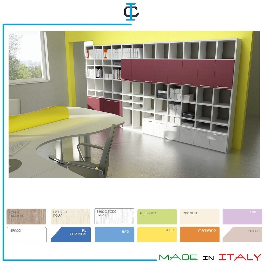 Libreria con ante e vani a giorno, moderna, realizzata in pannello ecologico certificato. Libreria personalizzabile su misura. Scrivania e sedia non inclusi. Altezze ripiani personalizzabili su richiesta senza variazione di prezzo. Design moderno