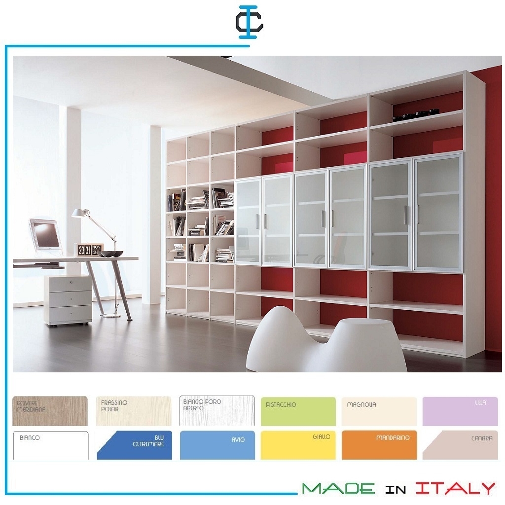 Libreria moderna realizzata in pannello ecologico certificato. Libreria personalizzabile su misura. Scrivania e sedia non inclusi. Altezze ripiani personalizzabili su richiesta senza variazione di prezzo. Design moderno