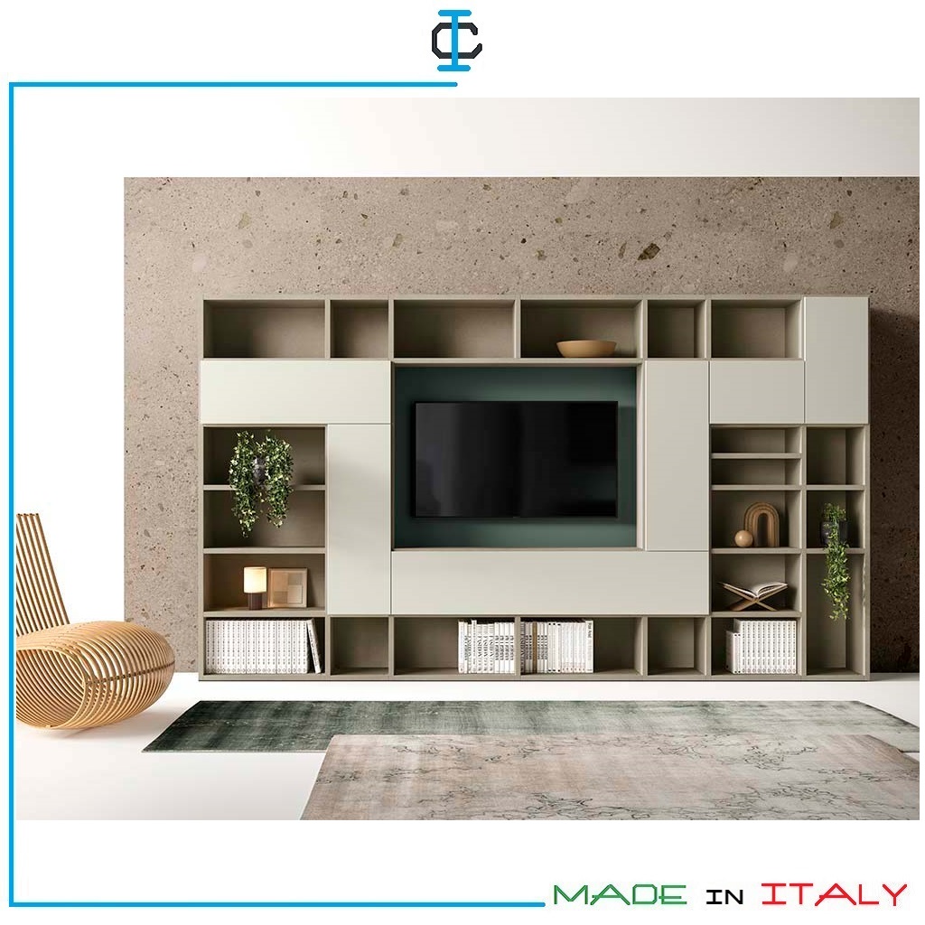 Libreria porta TV. Libreria soggiorno come foto composta da : colonne a giorno, zona TV, ante. Libreria realizzata in Pannello Ecologico in classe CARB P2 in finitura Argilla, laccato opaco Grigio Seta e Muschio. Stile Contemporaneo. Misure (cm): L.390 P.42 H.224