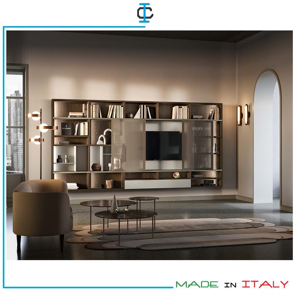 Libreria porta TV con Vetri. Libreria come foto composta da : librerie a giorno, ante vetro scorrevoli, cassetto. Libreria realizzata in Pannello Ecologico in classe CARB P2 in finitura Rovere Fiammato, laccato opaco Grigio seta, vetri Garzati. Stile Contemporaneo. Misure (cm): L.371 P.33 H.187