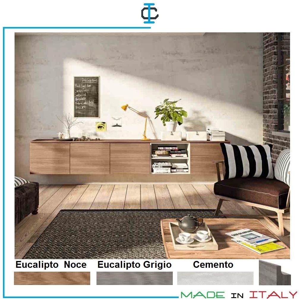 Madia Sospesa con vano a giorno, in stile moderno, apertura a gola. Composta da : 4 elementi con ante battenti, 1 elemento a giorno con ripiano. Ante termostrutturate sp. 22 mm. con maniglia interna integrata, tinta Eucalito.