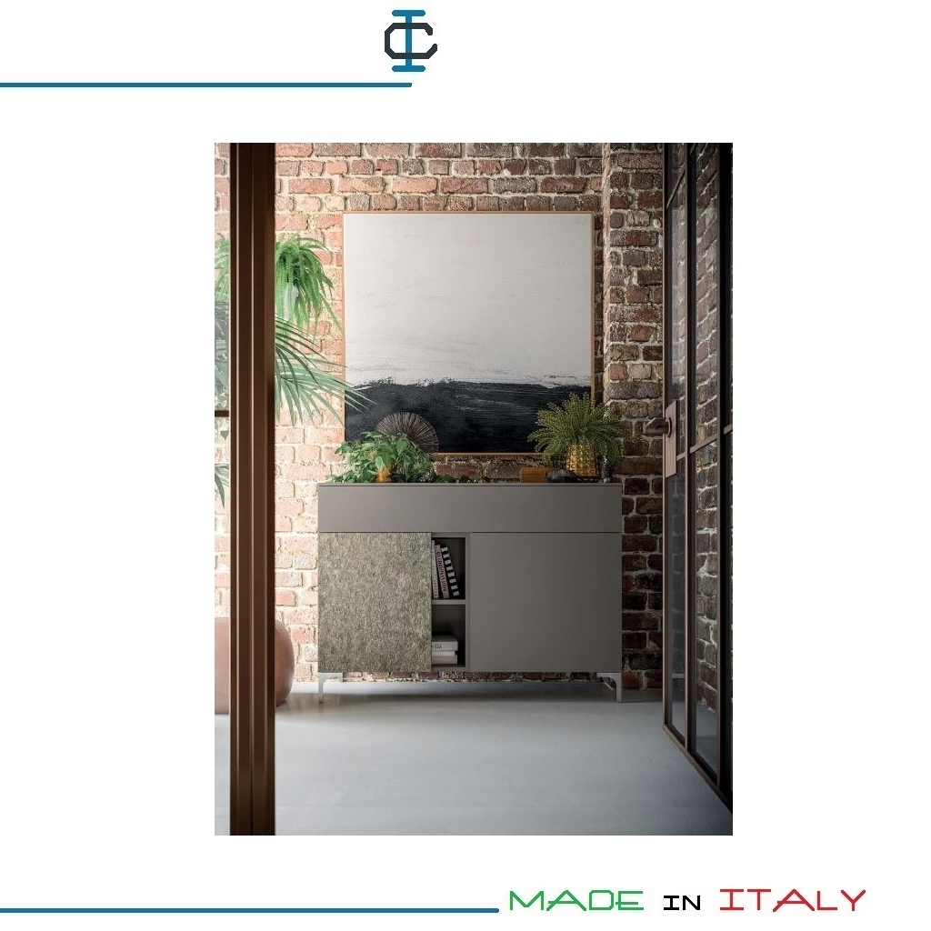 Madia tinta Pietra Smeraldo con piedini. Composta da due vani alti con anta battente, un vano centrale a giorno ed un ampio cassetto. L'interno è completo di un ripiano. Finitura laminato platino e pietra smeraldo.