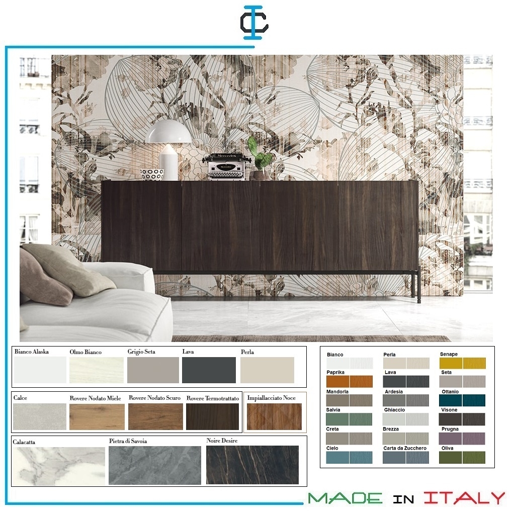 Madia con ante in Rovere Termotrattato. Madia con struttura in pannello ecologico, ante in materico finitura Rovere Termotrattato. Basamento in metallo h.25 cm. in finitura Antracite. Madia composta da : 4 ante, 1 basamento. Stile Contemporaneo. Misure (cm): L.250 P. 44 H.95