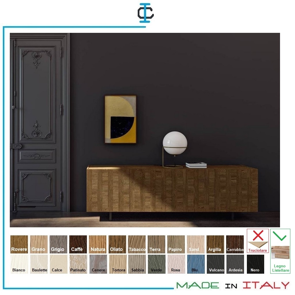 Madia con anta dogata. Madia in legno impiallacciato Rovere a doghe verticali ed orizzontali su pannello Legno Listellare, in finitura tinta Rovere. Madia con 4 ante , 4 ripiani , piedi in plexiglass o acciaio. Stile Contemporaneo. Misure (cm): L.240 P. 47,5 H.70 Escluso : Accessori