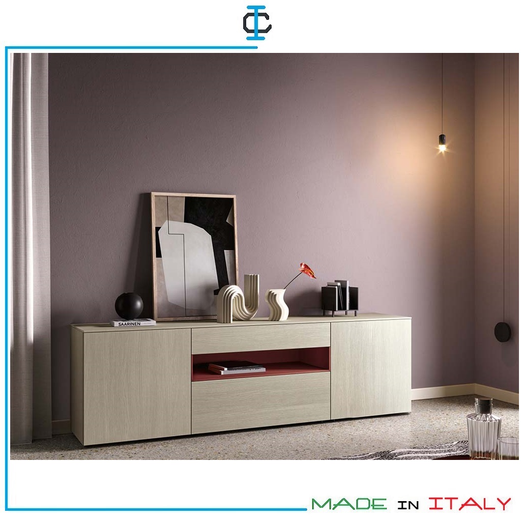 Madia Frassino e Porpora. Madia come foto composta da : 2 ante, 1 cassetto, 1 cestone. Madia realizzata in Pannello Ecologico in classe CARB P2, ante in finitura Frassino Cenere e laccato opaco Porpora. Stile Contemporaneo. Misure (cm): L.258 P.52 H.77