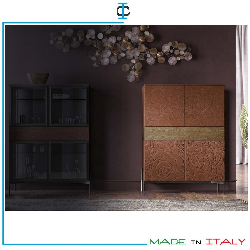 Madia Malta Mattone. Madia decorata con ante e piedi in metallo. Finitura malta tinta Mattone e Rovere. Madia realizzata in Pannello Ecologico in classe E1, con possibilità di tinte a scelta. Stile Contemporaneo. Misure (cm): L.110 P.42 H.148