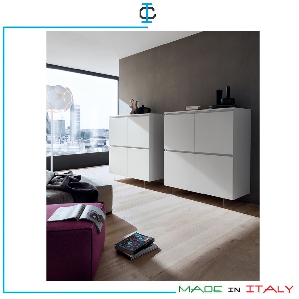Madie in Fenox bianco con piedini, composte da: 2 madie a terra con 4 ante, 4 ripiani in vetro interni. Design moderno. Materiali e produzione Made in Italy.