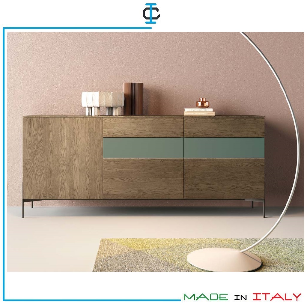 Madia in Rovere e Salvia. Madia come foto composta da : ante, cassetti e basamento in metallo. Madia realizzata in Pannello Ecologico in classe CARB P2, ante in finitura Laccato opaco Salvia, impiallacciato legno Rovere Yuta. Stile Contemporaneo. Misure (cm): L.221 P.51 H.93