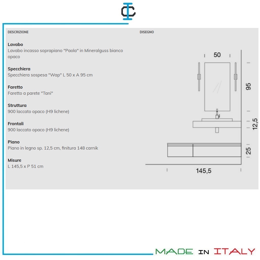 Mobile Bagno con Mensola. Mobile bagno completo di : 1 mensola, 1 Lavabo in mineral, 1 specchio, illuminazione, cassetto. Struttura in pannello idrofugo in classe E1. Design Contemporaneo Misure (cm): L.145 P.51 H.25 + 12 + 95