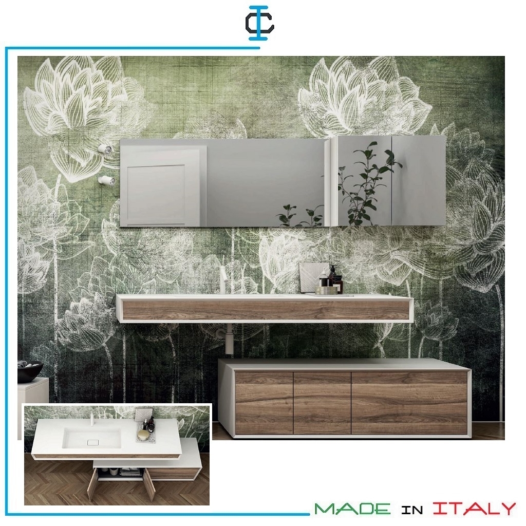 Mobile bagno con lavabo in Acrilik. Mobile bagno sospeso in finitura Noce Europeo, mobili con struttura in pannello idrofugo in classe E1. Mobile bagno composto da : 1 base 2 ante, 1 cassettiera, 1 top scatolato con lavabo in acrilik, 1 specchio, 1 specchio contenitore. Design Contemporaneo.