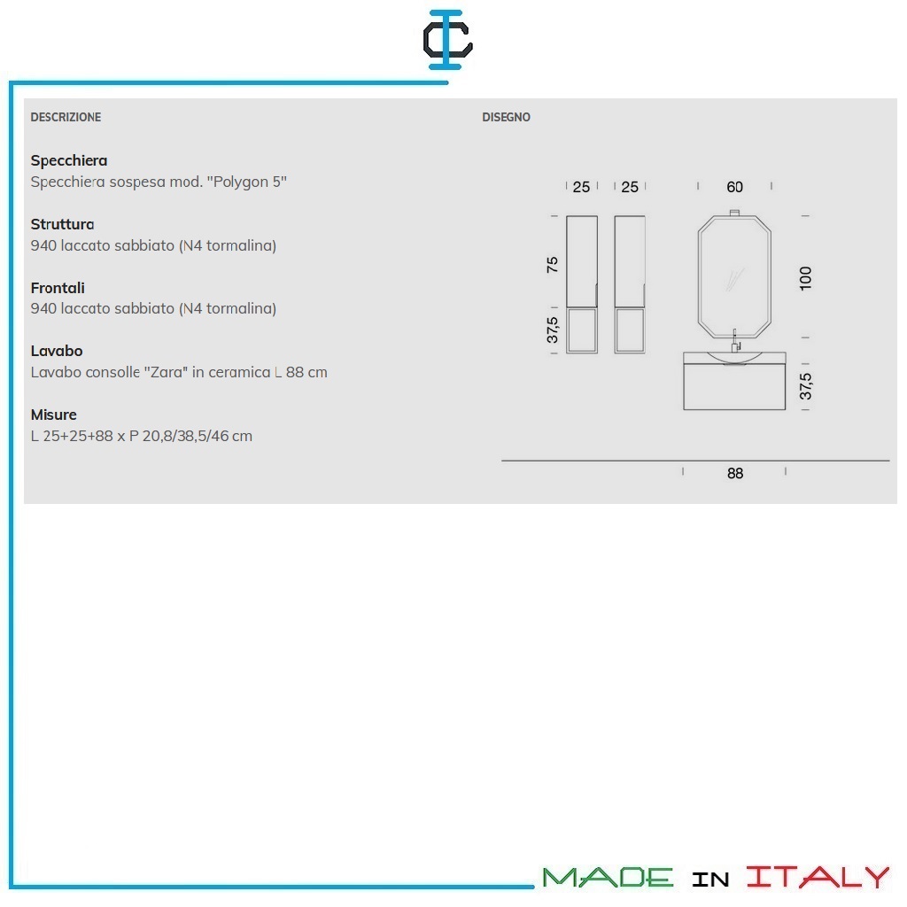 Mobile Bagno sabbiato. Mobile bagno completo di : 1 mobile, 1 Lavabo in ceramica, 1 specchio, illuminazione, pensili. Struttura in pannello idrofugo in classe E1. Design Contemporaneo Misure (cm): L.88 + 25 +25 P.20/46 H.37 + 100 + 112