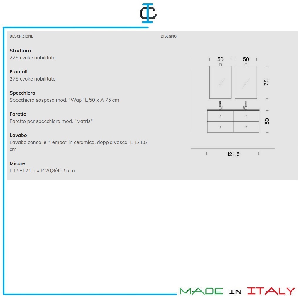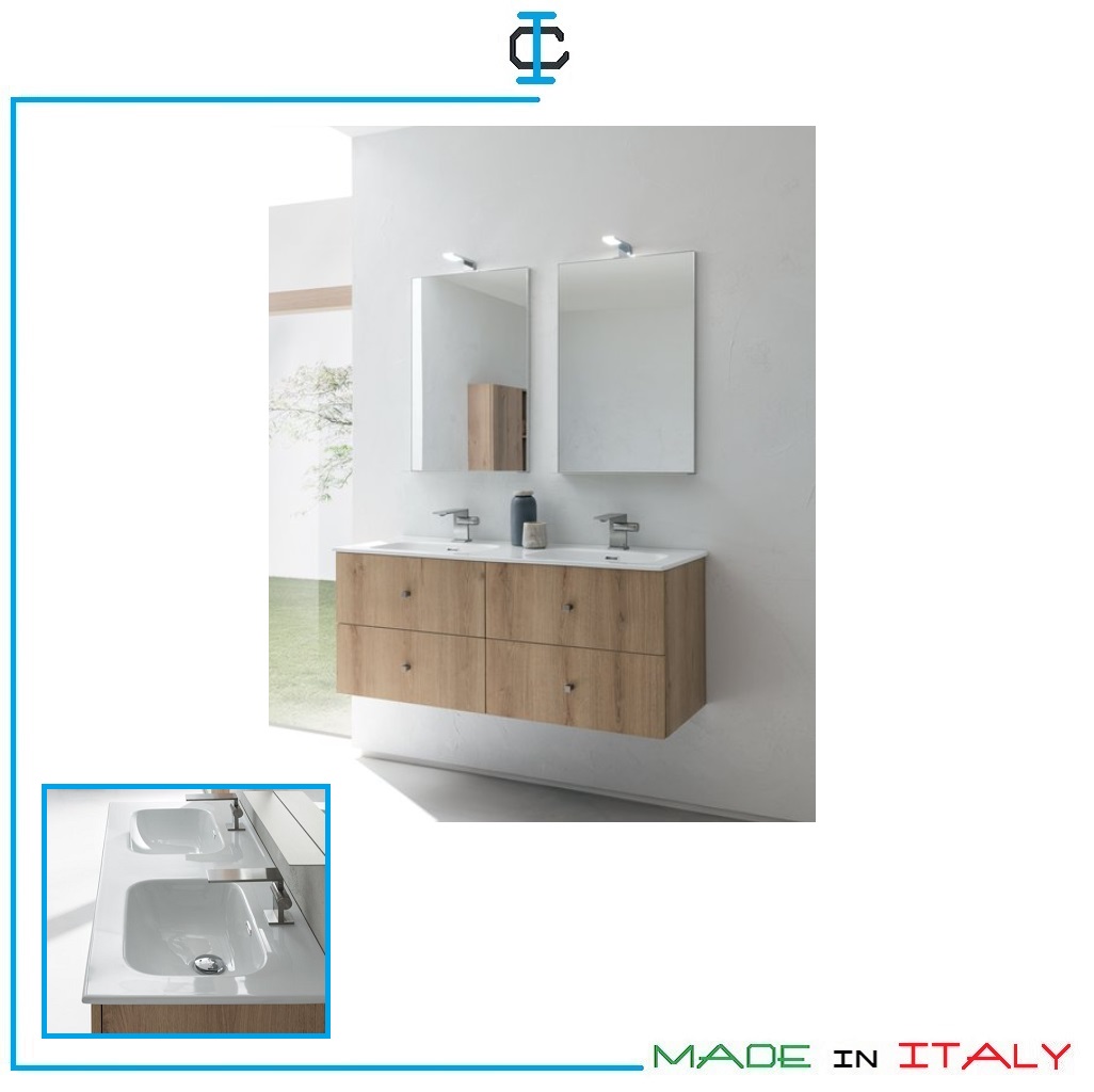 Mobile bagno 4 cassetti. Mobile bagno completo di : 2 mobili , 2 Lavabo in ceramica, 2 specchi, illuminazione. Struttura in pannello idrofugo in classe E1. Design Contemporaneo Misure (cm): L.121 P.46 H.50 + 75