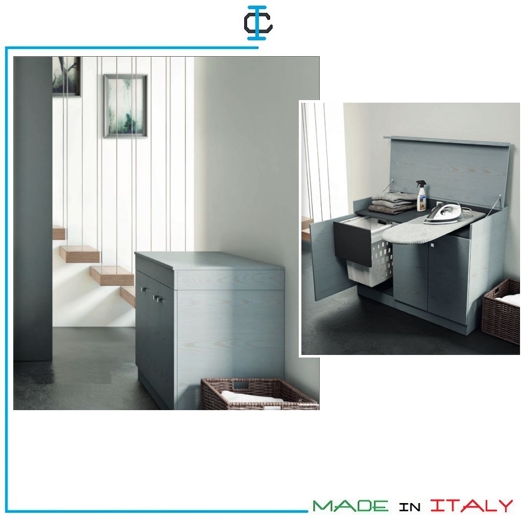 Mobile con asse da stiro e portabiancheria. Mobile lavanderia con struttura in pannello idrofugo in classe E1, finitura laccato opaco. Lavanderia composta da : 1 base porta asse da stiro con presa elettrica, 1 asse da stiro dx o sx, 1 base con 1 portabiancheria estraibile. Design Contemporaneo .