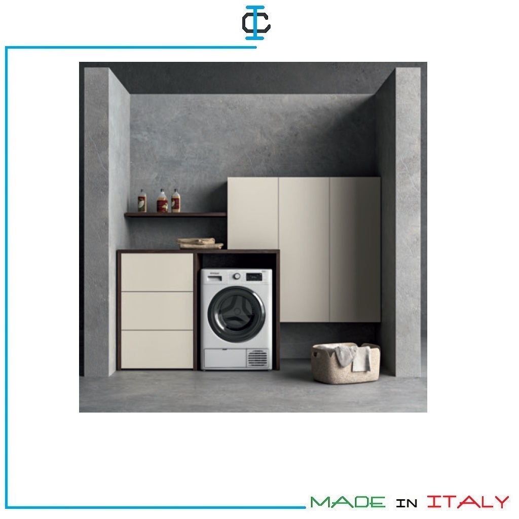 Mobile per Lavatrice. Mobile composto da : 1 cassettiera, 1 vano lavatrice, 2 pensili, 1 mensola. Armadio con struttura in Pannello Ecologico in classe E1 in finitura con tinte a scelta. Stile Contemporaneo. Misure (cm): L.270 P.60 H.170