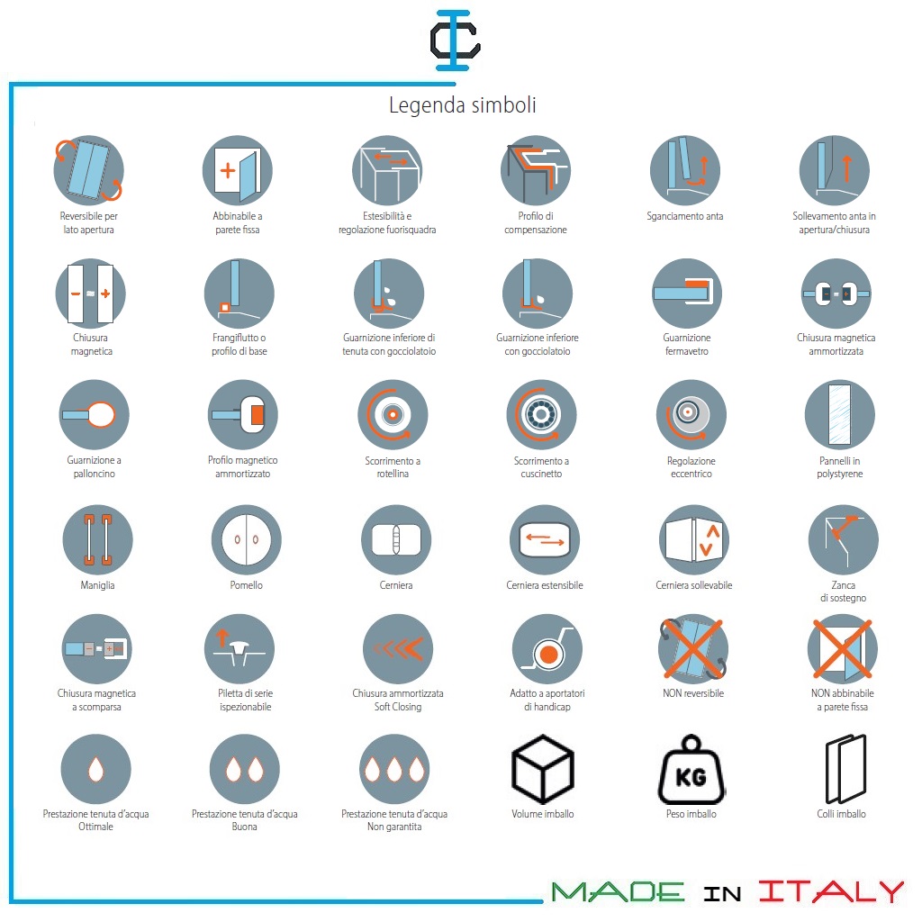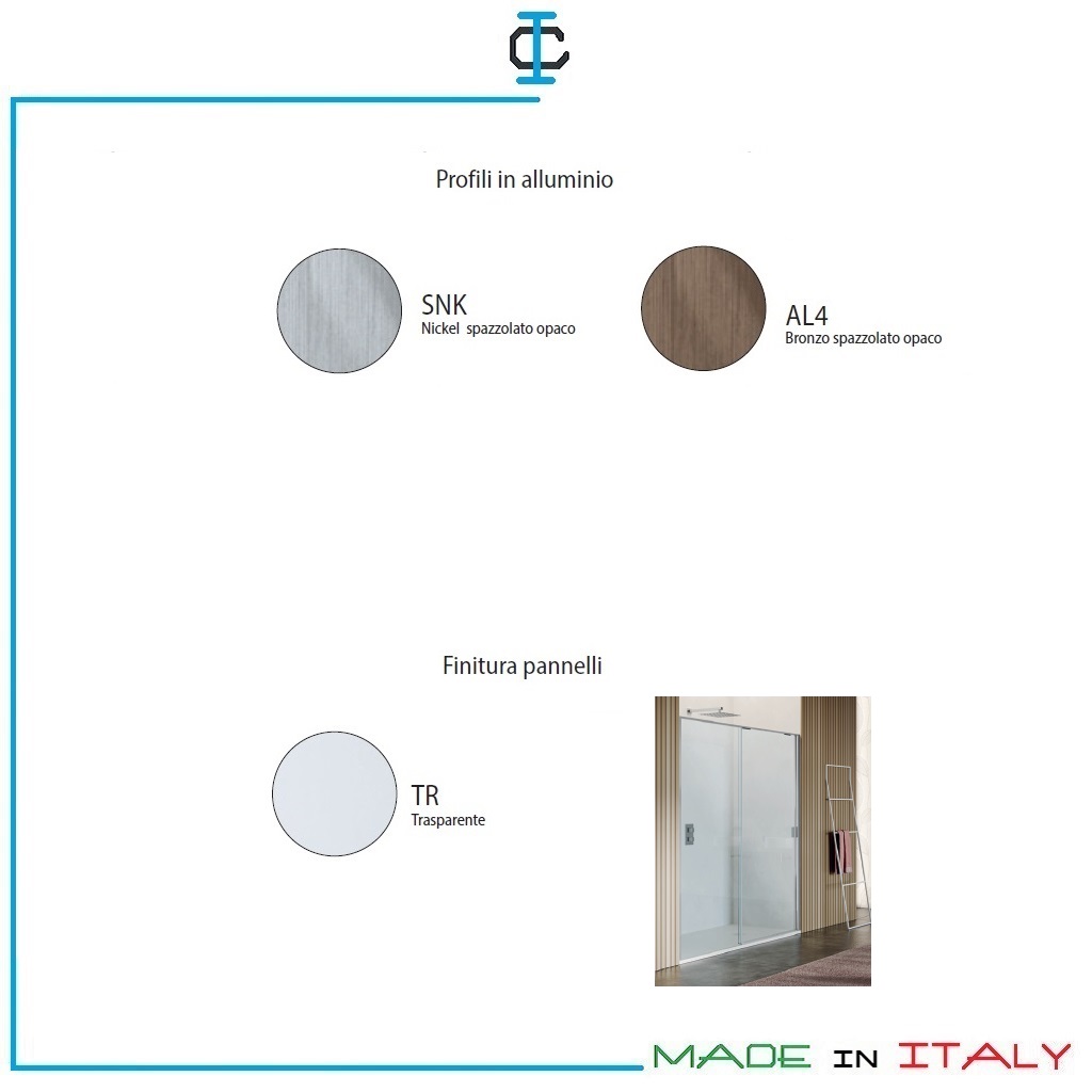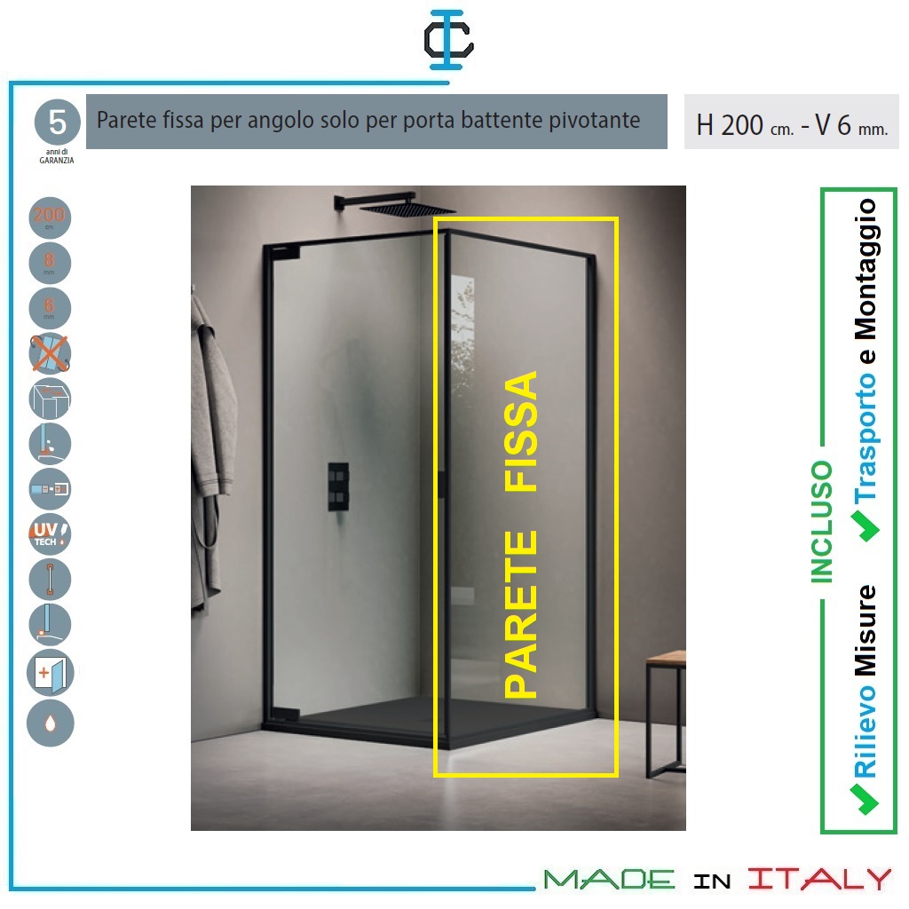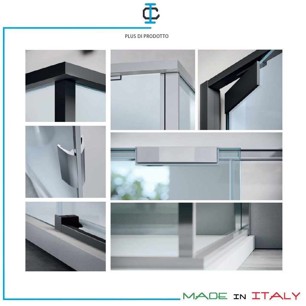 Plus di prodotto : • H 200 cm • Pannelli in vetro temperato 6 mm per porte scorrevoli e pareti fisse • Pannelli in vetro temperato 8 mm per porte battenti • Struttura in alluminio • Profili orizzontali H.1,5 cm • Profili verticali a muro H. 3 cm • Assenza di profilo inferiore su porta scorrevole 2 ante e parete fissa ad angolo dedicata • Cerniere pivot e cuscinetti incollati con tecnologia UV (facilità di pulizia e impatto estetico) • Profilo magnetico di chiusura in alluminio su porte scorrevoli • Profilo magnetico di chiusura in alluminio bilaterale a scomparsa a triplo magnete su porte battenti • Trattamento anticalcare StarClean di serie incluso nel prezzo