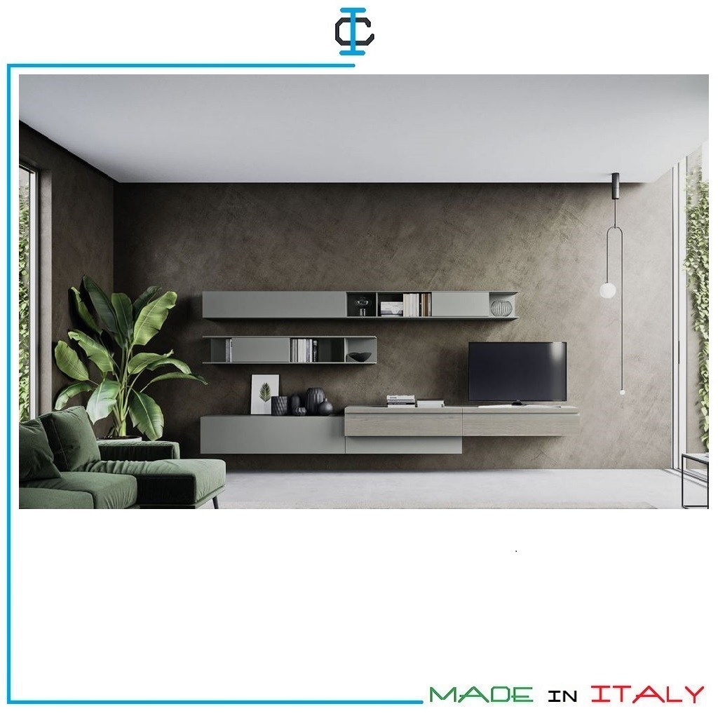 Pareti soggiorno porta TV sospese con possibilità di realizzazione su misura e con finiture e tinte a scelta.