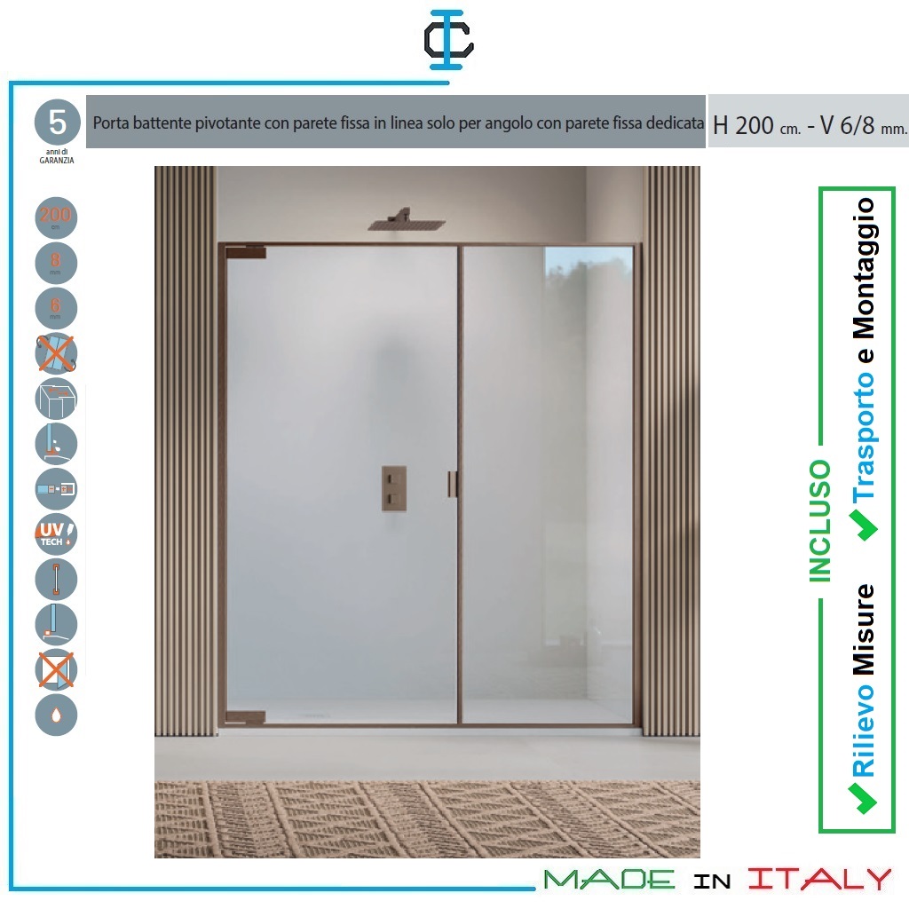 Plus di prodotto : • H 200 cm • Pannelli in vetro temperato 6 mm per porte scorrevoli e pareti fisse • Pannelli in vetro temperato 8 mm per porte battenti • Struttura in alluminio • Profili orizzontali H.1,5 cm • Profili verticali a muro H. 3 cm • Assenza di profilo inferiore su porta scorrevole 2 ante e parete fissa ad angolo dedicata • Cerniere pivot e cuscinetti incollati con tecnologia UV (facilità di pulizia e impatto estetico) • Profilo magnetico di chiusura in alluminio su porte scorrevoli • Profilo magnetico di chiusura in alluminio bilaterale a scomparsa a triplo magnete su porte battenti • Trattamento anticalcare StarClean di serie incluso nel prezzo