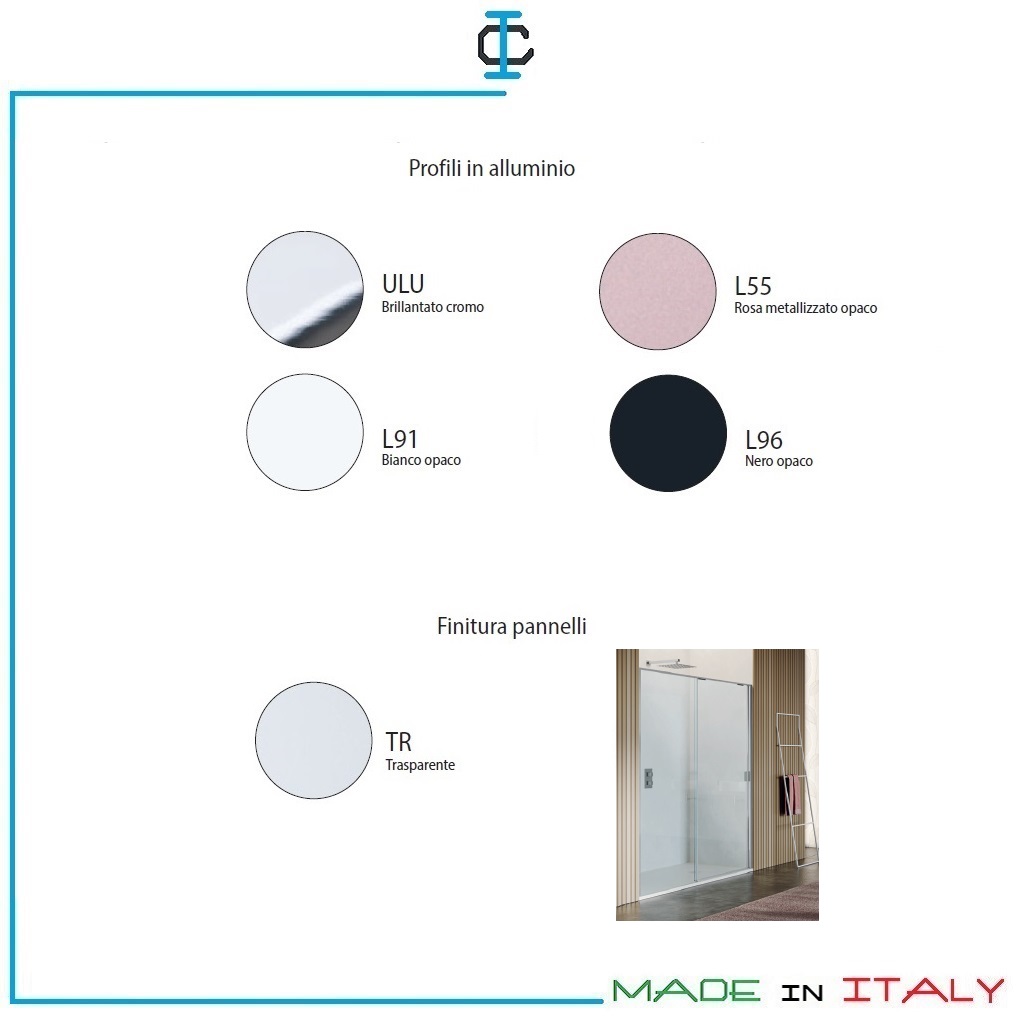 Profilo a scelta : Cromo , Bianco opaco, Nero opaco. Vetro Trasparente.