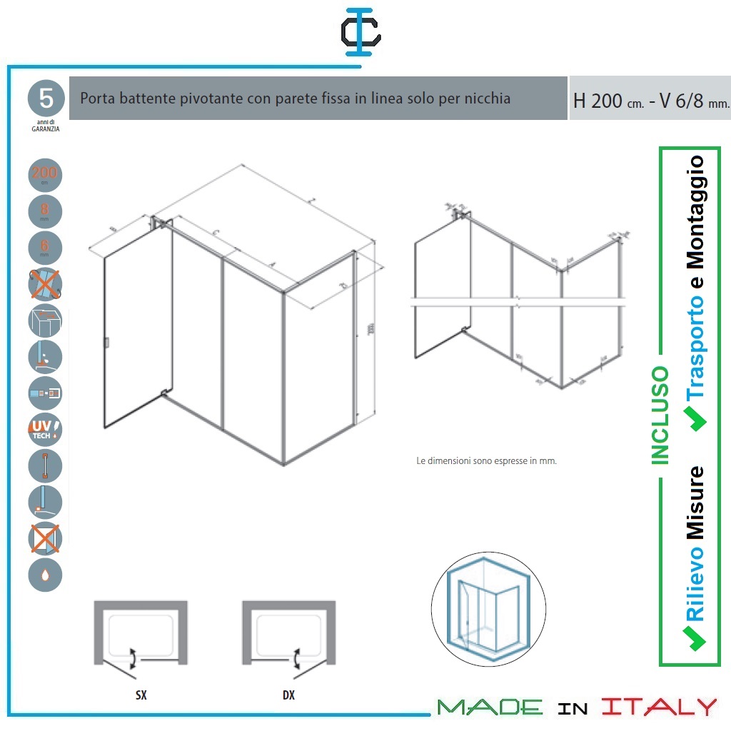 Porta Battente Pivotante con parete fissa per Nicchia. Profilo finitura Cromo e Vetro Trasparente. Porta ad un’anta a battente pivotante (8 mm.) con parete ssa in linea (6 mm.). Apertura verso l’interno e l’esterno. Sgancio rapido dell'anta per agevolare la pulizia. Apertura anta destra o sinistra.