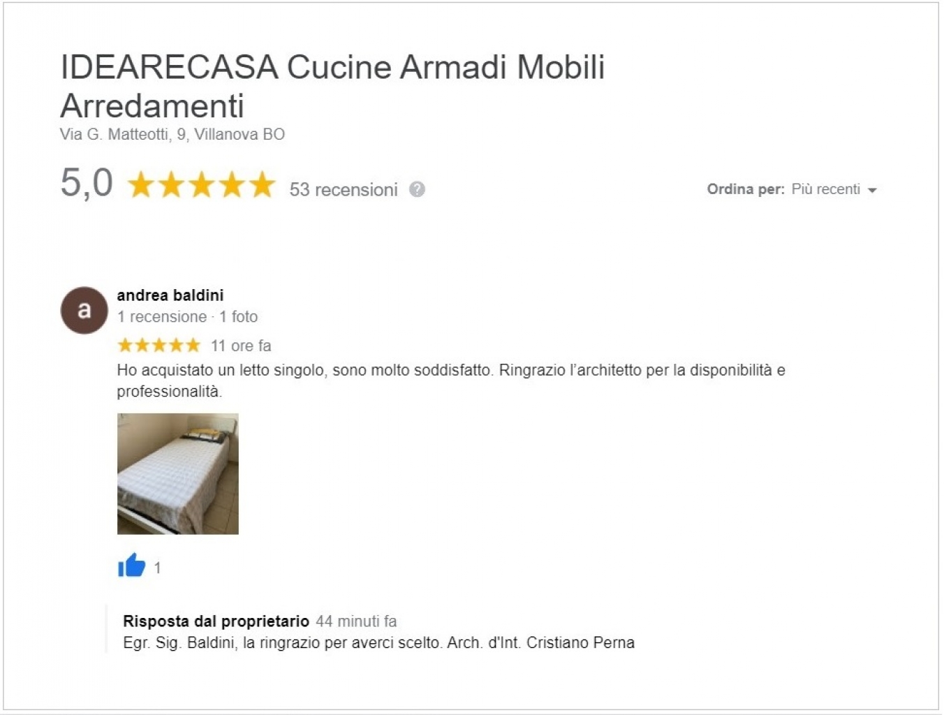 Recensione del Sig. Baldini di Conselice, cliente IdeareCasa. La cliente ha acquistato un letto per la cameretta del figlio . "Ho acquistato un letto singolo, sono molto soddisfatto. Ringrazio l’architetto per la disponibilità e professionalità." Recensioni ...