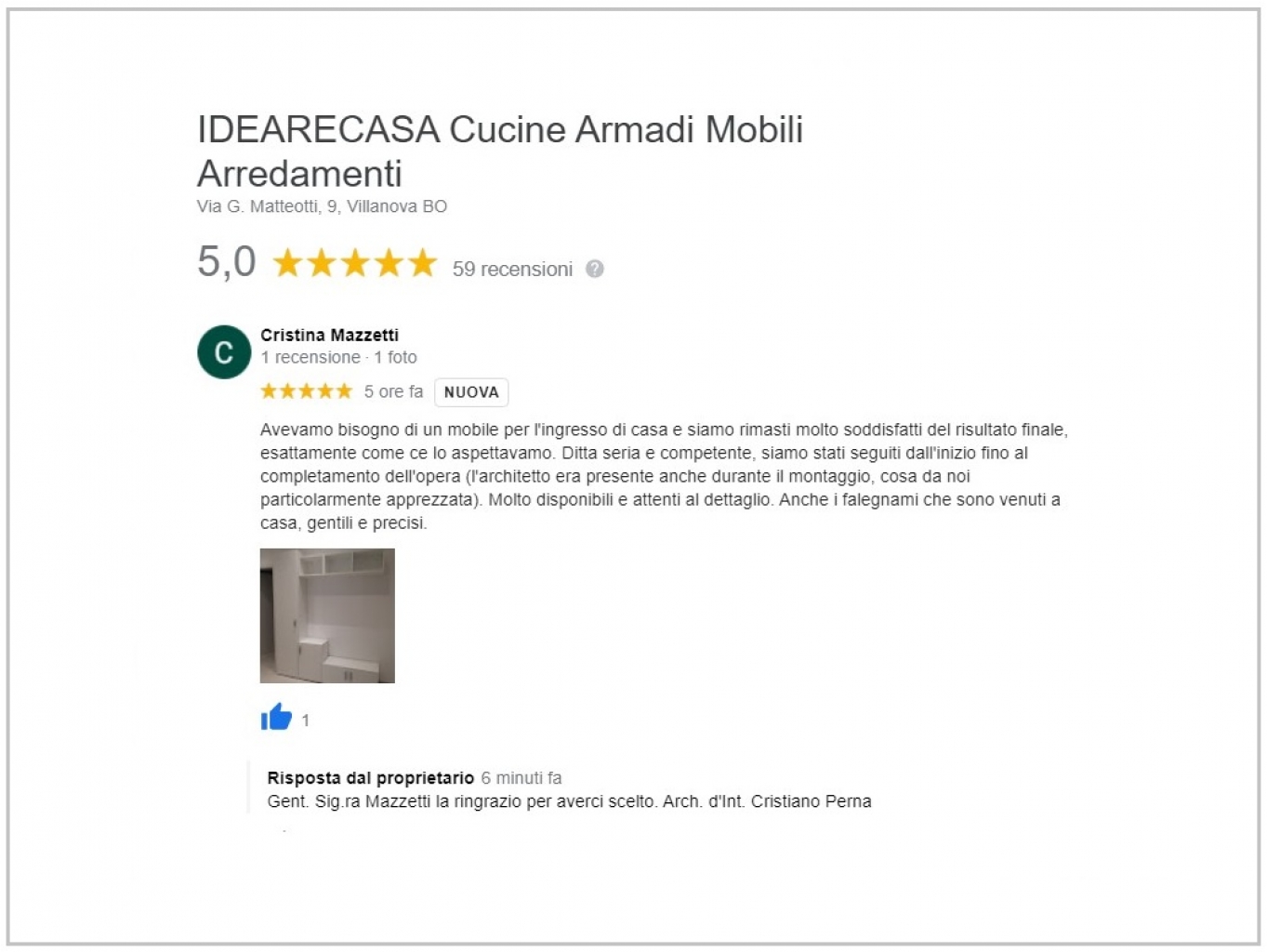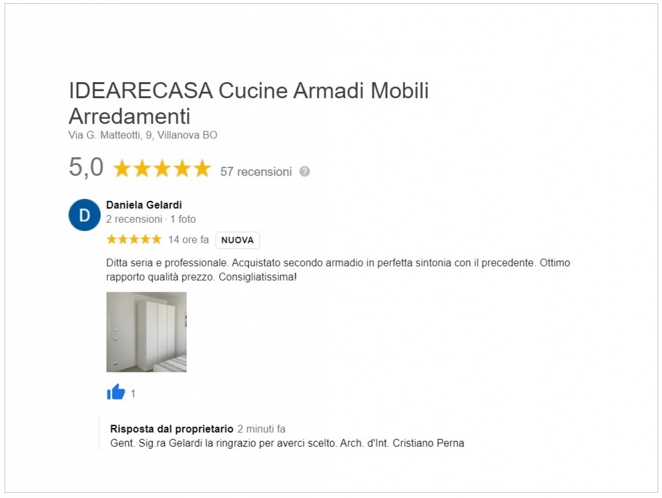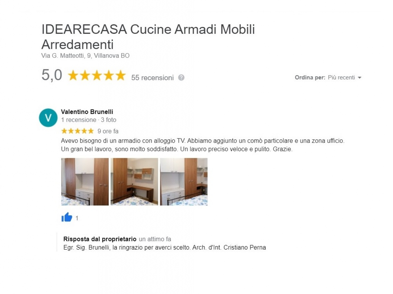 Recensione del Sig. Pescuma di Bologna, cliente VESTALIA. La cliente ha acquistato una cucina si misura ed un'armadio per il nuovo appartamento. "Ho comprato una cucina Vestalia e una camera con armadio a 7 ante tramite idearecasa di Castenaso. ...